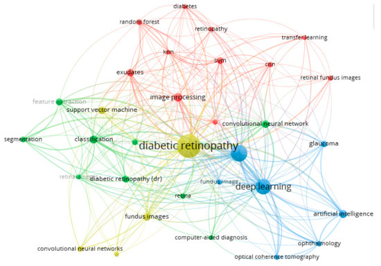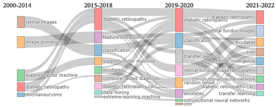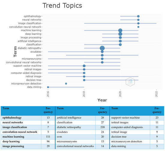 We analyzed the authors’ keywords over the period (2010 to 2021) and identified the trend of the keywords used. Terms such as exudates, microaneurysm, SVM, and computer-aided diagnosis appeared in 2016. These terms indicated that SVM classifiers were used to detect exudates and microaneurysms in most of the papers. Similarly, we found that decision trees were used in addition to SVM in 2018. More emphasis was given to the keyword diabetic retinopathy. Later, in the year 2020, machine learning and deep learning became the trend (Figure 14) to be used.