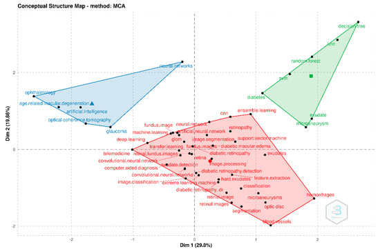 The conceptual structure map was obtained from Biblioshiny using the multiple component analysis (MCA) method. This method is commonly used to analyze categorical data, which seeks to narrow down a vast number of variables into smaller sets of components that sum up the information in the data [13]. The conceptual structure is shown in Figure 16. It was found that exudate and microaneurysm lesions were detected by using SVM, random forest, kNN, and decision tree machine learning algorithms, which formed a single cluster. Author keywords such as ophthalmology, age-related macular degeneration, and optical coherence tomography were most frequently used, along with artificial intelligence, creating a second cluster. The maximum number of author keywords belonged to the third cluster, which included retinal landmarks (optic disc), lesions (hemorrhages, hard exudates), and fundus images. Moreover, most papers used the terms segmentation and machine learning techniques such as SVM, kNN, and advanced techniques such as deep learning, extreme learning machine, and transfer learning. The segmentation was generally used to locate retinal landmarks, lesions, etc., and machine learning techniques for classification.