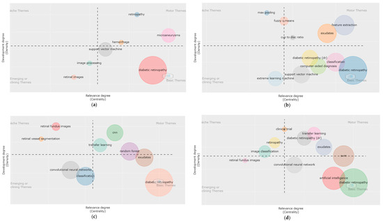 Thematic map of author keywords is plotted with the relevance degree and the work quantity for all four time slices shown in (a–d).