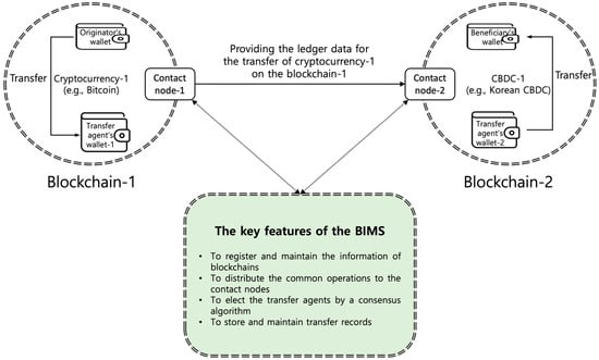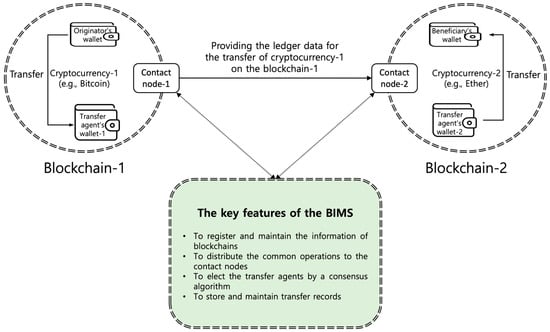 - BIMS elects transfer agents with wallets on blockchain-1 and blockchain-2 by a consensus algorithm;