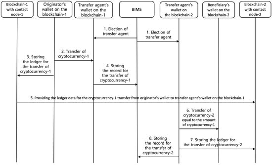 In Figure 4, cryptocurrency-1 (e.g., Bitcoin) is transferred from the originator’s wallet to the transfer agent’s wallet-1 on blockchain-1. Contact node-1, running on blockchain-1, directly provides the ledger data for the transfer of cryptocurrency-1 to contact node-2, running on blockchain-2, without any intermediaries (see Figure 2). CBDC-1 (e.g., Korean CBDC) is transferred from the transfer agent’s wallet-2 to the beneficiary’s wallet on blockchain-2.