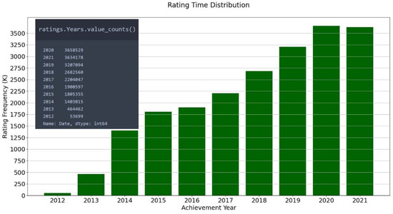The validated ratings were carried out by users in the period of 10 years between 2012 and 2021, as few reviews were found before the year 2012. Those were discarded, with only those carried out in the period of highest frequency shown in Figure 3 prevailing.