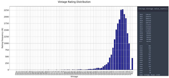In addition to the validated rating numbers illustrated in Figure 3, involving reviews were performed by users, Figure 4 illustrates the evaluated wine vintages, when the rated wines were produced. This is important because wine is a product with great durability when compared to others. It can be aged for many years in different containers until it is ready for human consumption and has a shelf life of many years [1,38]. The possibility of cataloging the storage time was considered along with numerous other candidate attributes, but this was rarely available in the collected data. The vintages or the grape harvests were identified in abundance.