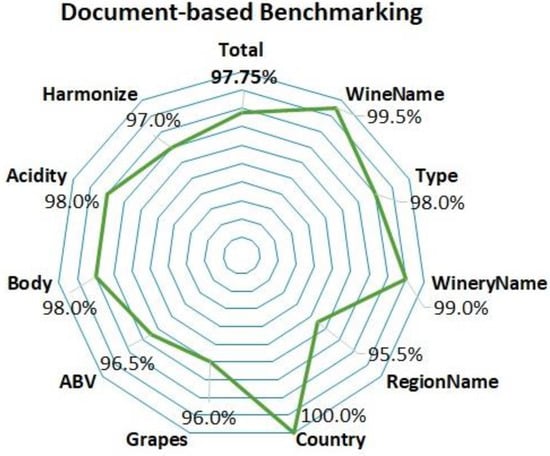 The document-based benchmark global result had a coincidence of 97.75% and standard deviation of 4.15%. This result was obtained by averaging all proportions of data obtained from the Web with the official datasheet from producers. Thus, with a 95% confidence interval, the true mean of assertiveness is between 96.94% and 98.56%. Specifically, the processes described in the previous sections were able to obtain 100% accuracy in the categorical attribute “country”. Close results were found when checking the other attributes, with accuracy still high. According to [1,37], in the winemaking process, grape varieties and ABV values may vary by different vintages, explaining some of the discrepancies found in these attributes obtained on the Web. The body and acidity attributes contributed a large amount of information found in the users’ evaluations, considering what most of them reported when these data were not found in some sources, and obtained a high accuracy percentage. The harmonize attribute is a very particular issue to be evaluated, and it was considered a match when at least one parity indication coincided. The largest adjustments were necessary in the wine region attribute, containing the name of the region of the wine’s origin. The region is usually presented as found on the label (appellation region), but these labels can also display the geographic region or subregion from the producing country or even the region of the winery, which sometimes differs from where the wine was produced. One aspect of the document-based benchmark was the finding two white wine types advertised widely on the Web in this way; however, in the official datasheet they are listed as the dessert wine type, with high levels of residual sugar in the product.