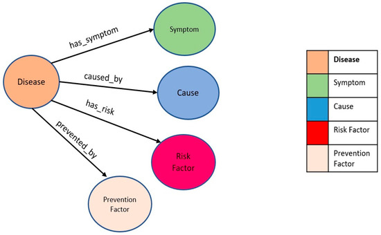 Text pre-processing techniques are applied during the parsing stage where all parsed information is pre-processed by removing punctuation, brackets, apostrophe-s, and s-apostrophe. This step is checked and compared with the website information until an acceptable accuracy level of parsed data is achieved. After the data filtration step, each disease, symptom, risk factor, cause, and prevention factor is given a unique number so that each item is represented once in the created online-based knowledge database. The data filtered is used for creating and extracting relationships, then generating Resource Description Framework RDF triples based on the core RDF for the knowledge graph showing four relationships as illustrated in Figure 3. The output of this stage is an online-based knowledge graph composed of triples based on the content parsed and processed from the MayoClinic encyclopedia. The graph resulted in 9,387 nodes of 5 labels—‘Disease’, ‘Symptom’, ‘Cause’, ‘PreventionFactor’, and ‘RiskFactor’.