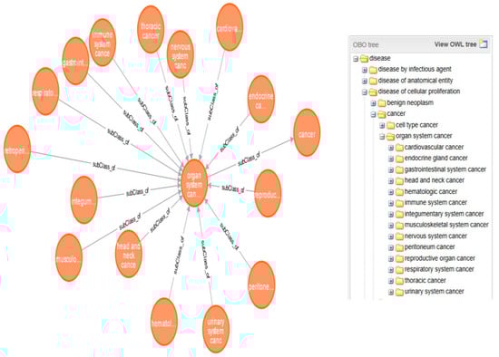 A subgraph of ‘organ system cancer’ concept with its superclass, subclasses, and the corresponding DO sub tree.