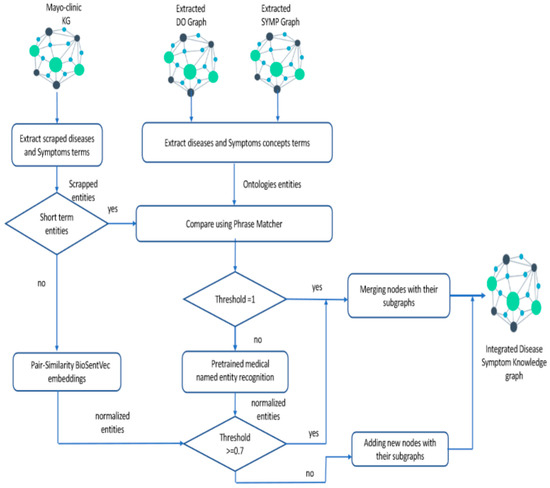 Healthcare information systems must employ innovative methods and techniques for handling and processing such big data to extract usable information and knowledge due to the volume, velocity, and range of issues and challenges that face the process of managing such data in healthcare. Many intelligent healthcare systems have recently demonstrated enthusiasm for utilizing semantic web technologies with healthcare data to transform data into useful knowledge and intelligence [3,4,5,6,7]. Relying on semantic-based techniques to manage heterogeneous data in the healthcare domain assists medical doctors and users in early disease prediction if any disease ailment is detected. Intelligent healthcare systems need to rely on trustful resources and integrate these resources into a reliable knowledge base for such systems. One of these resources is standardized medical ontologies which provide reliable and standard representation of the concepts of medical terminologies and the relation between them [8]. Currently, although each disease is diagnosed by certain defined symptoms, there are no existing ontologies or knowledge bases that link diseases with their symptoms. Despite the existing suggested models, most of them generate knowledge bases manually or automatically by focusing on a limited number of diseases. Integrating diseases and symptom ontologies into a knowledge base provides a strong base for any intelligent healthcare system. One of the forms of a knowledge base is building a knowledge graph for combining structured and unstructured medical data. This helps in visualizing the data, giving it the ability to analyze and infer new rules for enriching the knowledge base [9,10]. The following subsections discuss the need for constructing a knowledge graph of diseases and their symptoms, linking the knowledge graph entities to standardized ontologies, and thus integrating two medical standardized ontologies into a knowledge graph.