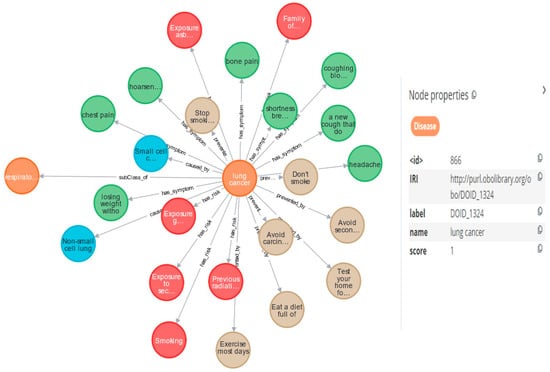 The graph involves 11539 relationships of 4 distinct types—‘has_symptom’, ‘caused_by’, ‘prevented _by’, and ‘has _risk’. Figure 4 shows a subgraph of the disease ‘lung cancer’ from the generated knowledge graph with all its relationships with other nodes representing lung cancer disease symptoms, causes, risk factors, and prevention factors as stated on the MayoClinic website. The output of this stage is an online-based knowledge graph composed of triples based on the content parsed and processed from the MayoClinic encyclopedia. The graph resulted in 9387 nodes of 5 labels—‘Disease’, ‘Symptom’, ‘Cause’, ‘PreventionFactor’, and ‘RiskFactor’.