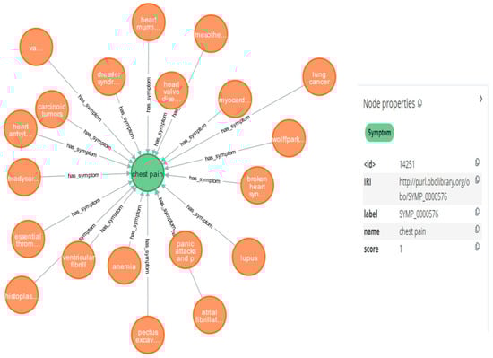 The merged nodes have the properties from either the disease graph or symptom graph, including the property IRI. Thus, these merged nodes are linked to the standard ontologies and their internationalized resource identifier. The merged node has an additional property ‘score’ having a value of ‘1’ indicating the certainty of semantic relatedness of the node to the standardized concept. Figure 8 shows the ‘lung cancer’ disease from the online-knowledge graph integrated with the disease graph, the merged node has the relationships from the disease graph (the superclass and its subclasses) together with the relationships from the online-knowledge graph ‘has_symptom’, ‘caused_by’, ‘prevented_by’, and ‘has_risk’ relationships. The figure also shows the node properties of the ‘lung cancer’ node having a property score of 1, IRI, and unique identifier of the disease ‘lung cancer’. Figure 9 shows the node properties of one of its symptoms ‘chest pain’ node having a property score of 1, IRI, and a unique identifier of the symptom ‘chest pain’.