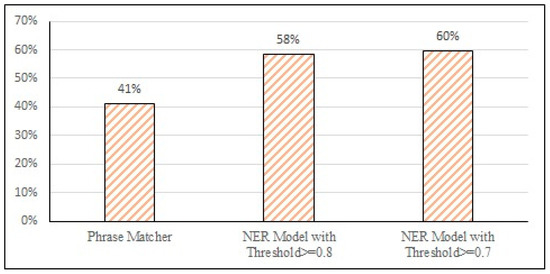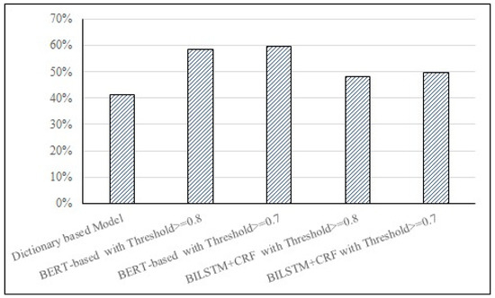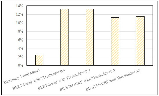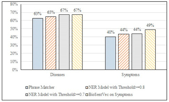 Further experiments are also conducted to evaluate the percentages of diseases and symptoms interlinked from the overall linked knowledge graph based on dictionary-based models (Phrase-Matcher) versus BERT models with different thresholds, and the BILSTM with CRF-based models with different thresholds. Figure 12 shows the comparison for diseases, whereas Figure 13 shows the comparison for symptoms. The results showed that BERT-based models achieved better results in nodes’ linking, and thus it was chosen for generating the proposed knowledge graph.