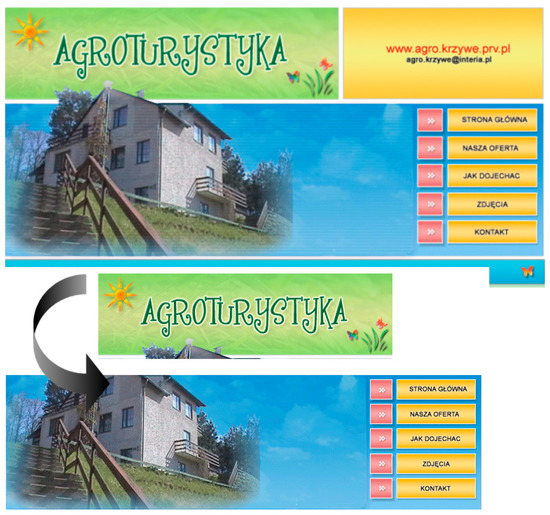 The graphic design of archaic agritourism websites included various graphics, such as pictograms or icons representing service standards, amenities, and types of tourism attractions found on the farm. Many featured visitor counters that were then replaced by sophisticated statistics systems. The websites used various graphics for navigation, information, presentation, and decoration. Fauna and flora and ready-made navigation, including menu buttons, were often employed (Figure 6).