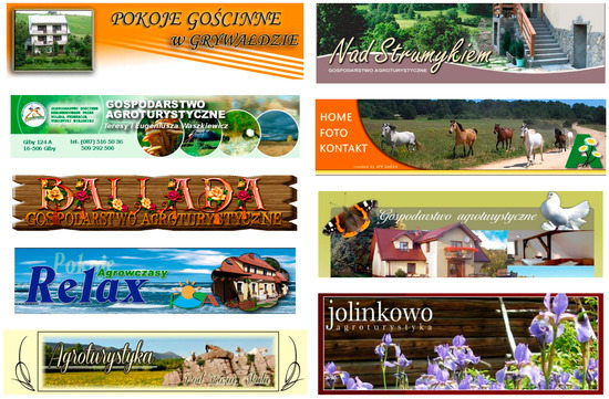 The study involved selective structuration and combination of data from an analysis of copies of archived websites from the digital archive followed by a juxtaposition with ccTLD website analysis. The research consisted of the identification of rustic cyberfolklore and ready-made graphics, including banners and ready-made layout components, such as shading, rounded corners, and menu backgrounds. We noted graphic banners on the websites used as website headers, i.e., placed in the <head> section. Such banners are usually single files compiled from multiple components, such as graphics, photographs, and text [42]. They are simultaneously a structural component of the graphic layout and an information carrier with farm names and contact details.