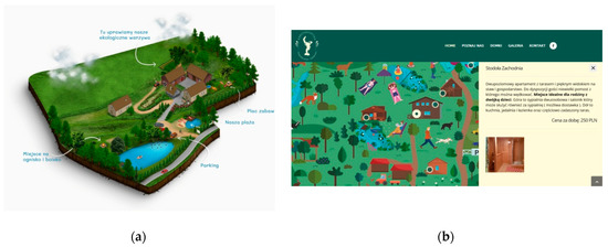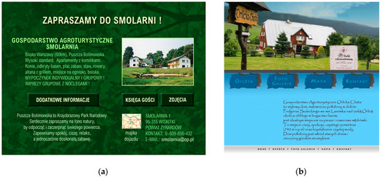 The way in which Polish agritourism offers are presented follows the global evolution of development techniques and design [55,56]. Static, Web 1.0 websites from ready-made components navigated by clicking and managed through FTP have been replaced by responsive, interactive Web 2.0 websites that combine click and scroll navigation. A certain direction of concept and development changes emerges from the analysis of the design and presentation of the Polish agritourism offer. Navigation and browsing with a mouse (or another I/O device) give way to the user’s hand (fingers).