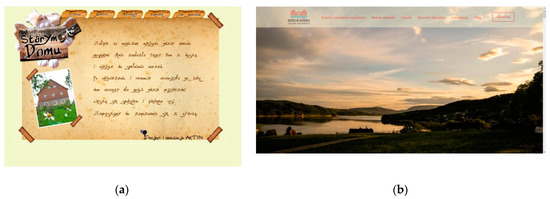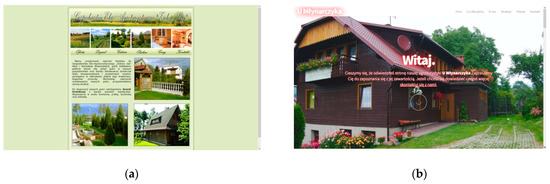 (a) A comparison of website design against a 1920 × 1080 px display: old design, http://agroturystyka-zielonygaj.pl (accessed on 18 September 2022)—A static website with a typical banner, ready-made components, including a menu, banner, ‘page border’, a typical, centred rectangular Web 1.0 content container of about 950 px structured with DIV tags and tables; (b) http://umlynarczyka.pl (accessed on 18 September 2022), a responsive website that takes up the entire viewport width with a hero image and all content in a single hypertext document.