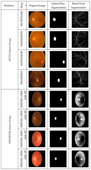 Figure 2 shows the original images of APTOS and MESSIDOR datasets and their respective optical disc segmented images applying U-Net_OD and blood vessels images applying U-Net_BV.