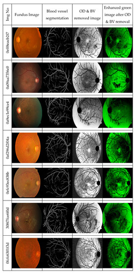 Figure 3 shows the results of the (a) blood vessel, (b) optic disc segmentations (c) after the removal of the blood vessel and optic disc, the green channel image is enhanced. Then the enhanced green channel images are resized to 512 × 512 images and used as the input to the convolutional network.