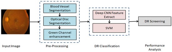 Fluorescein fundus angiography (FFA) [10] is the process of detecting macular degeneration and manual DR classification by an ophthalmologist. In this case, fundus images are manually examined [11] to understand the health of the retina, optic disc, choroid, blood vessels, and macular condition of the eye. Image level annotation is done in terms of DR grade [12] by an ophthalmologist. The ocular macula helps to focus the eye; hence, macular degeneration causes blurred vision and sometimes destroys central vision. The FFA process is time-consuming, and the result depends on the experience of the ophthalmologist. In addition, there is also a risk of adverse effects from the fluorescent dye used in FFAs. Automatic DR screening is a process of detecting and grading DR from the fundus image with a computerized system; it is hazard-free, cheaper, and can help experts make better decisions. This motivated researchers to employ a computer-aided diagnostic (CAD) system [4,13,14] for the early detection of DR. It may also be useful to observe and monitor the development of other micro-vascular impediments. The two major aspects of the CAD system for DR detection are precise segmentation of the blood vessels (BV) and optic disc (OD) [4,15], followed by proper classification of the lesions in the fundus images. Several approaches have been proposed by researchers to develop an automated DR diagnostic system. Traditional machine learning (ML) approaches show competent efficiency only if hand-engineered features [2,6,16,17] are chosen proficiently. Here, the process of manually selecting features is stimulating and difficult to generalize. Various deep learning (DL) techniques [3,18,19,20,21] are also proposed to explore the state of the retina from the fundus image. In this case, the performance depends on the architecture of the deep neural network and its tuning parameter. The efficacy of the automated DR diagnostic system is decided by the efficiency of all the different stages, such as the segmentation of the blood vessels, the extraction of the optic disc region [3], and then the detection and classification of DR.