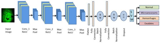 In this proposed model, the CNN architecture consists of seven convolution layers, where each layer comprises a convolution operation followed by ReLU and MAX pooling operations. The ReLU activation function introduces the nonlinear to the output convolution layer. The pooling layer performs the down-sampling operation that reduces the size of the image after each convolution. Then the image is flattened to a fully connected feature vector of size 1 × 1024, which is followed by two dense layers that reduce the feature vector of size 1 × 512, then finally reduced to a size of 1 × 64. The soft-max value computed at the pixel level is used to calculate the energy function over the feature map, which also includes the cross-entropy loss as a penalty value. Classification is done using SVM with a sigmoid kernel function, as the DR classes are linearly separable. The cross-entropy loss at each position is defined by Equation (5) [3].