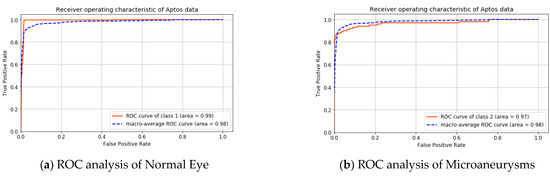 A graphical analysis of the APTOS dataset is presented in Figure 6 and Figure 7. The ROC curve of the individual class and the macro-average are shown in Figure 6. The area under the curve for the macro-average is 98.0%. The area under the curve for the non-diabetic case is 99.0% and 97.0% for microaneurysms, this is 98.0% for hemorrhages and exudates.