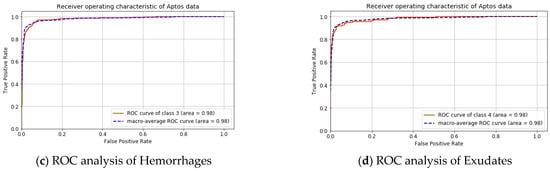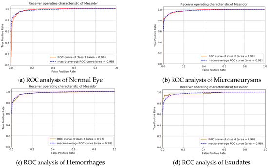 The analysis of the MESSIDOR dataset is shown in Figure 8 and Figure 9. In Figure 8, the ROC curve of the individual class with the macro-average value is shown. Here the area under the macro-average is 98.0%. The area under the curve is 98.0% for non-diabetic cases, microaneurysms, and also for exudates. This value for hemorrhages is 97.0%.