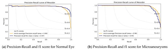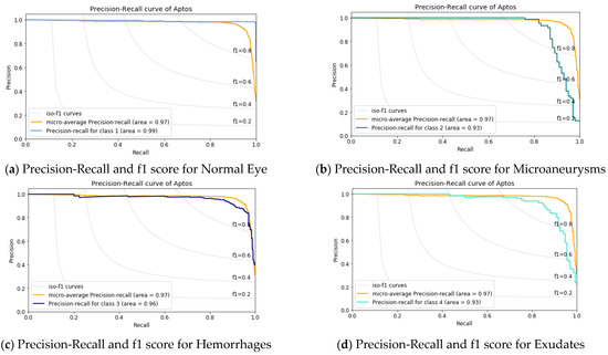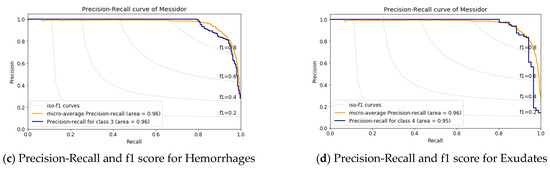 The precision vs. recall curve for the MESSIDOR dataset is shown in Figure 9; here, the macro-average value is 96%. Figure 9a shows class-1, i.e., the normal eye having an AUC value of 97% and an AUC value of 95% for Microaneurysms and Exudates shown in Figure 9b,d, whereas, for the Hemorrhages case, it is 96.0% as in Figure 9c. This result implies there is more inference in case-1, i.e., the normal eye and in case-2, which is Microaneurysms.