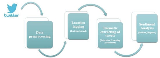 A three-step method is used to analyze the effect of COVID-19 on education through the processing of users’ tweets (Figure 1). In the first step, we pre-process a large dataset of tweets related to COVID-19 [19] and then determine their location. In the second step, we thematically extract the tweets using a lexicon-based method. In the third step, we analyze the sentiments of the tweets and classify them into two categories of positive and negative tweets.