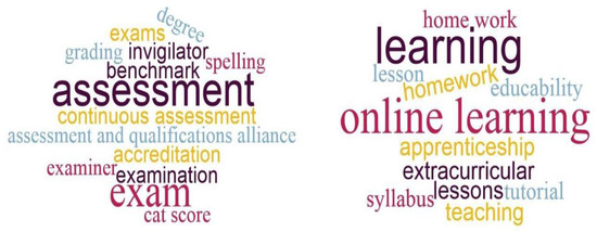 Learning and assessment have always been two important factors in education [22,25]. The importance of these two subjects, as well as the ever-growing concern about them, are more relevant nowadays following the COVID-19 pandemic and the change in teaching and learning methodologies. Likewise, we use a lexicon-based method to extract tweets related to each of these educational factors. In doing so, from the words of the education lexicon, we specify the words related to these two parameters and create a dictionary for each of them. The dictionaries related to the two parameters of learning and assessment consist of 12 and 13 words, respectively. In this way, we will have a lexicon of related words for each parameter, the vocabulary of which can be seen in Figure 4. Now, using the compiled dictionaries, the educational tweets related to each of the two parameters can be identified.