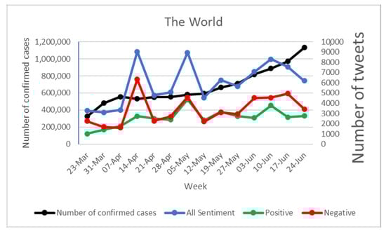 Frequency of all, positive, and negative tweets, and the official COVID-19 cases for the whole world.