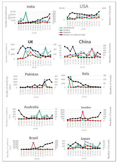 What is evident in the figures is that over the chosen time period, as the number of patients increases, so does the number of tweets related to COVID-19 and education. Moreover, most of the related tweets posted have negative content. To clarify the reason for the negative sentiment of the related tweets, we examined the text of the tweets in the weeks with the most negative tweets. As a result, we found out that people’s big concerns are often about how to graduate, exam cancelation, and school and university closure. Therefore, it can be concluded that following the outbreak of the COVID-19, people around the world were concerned about their education or that of their children.