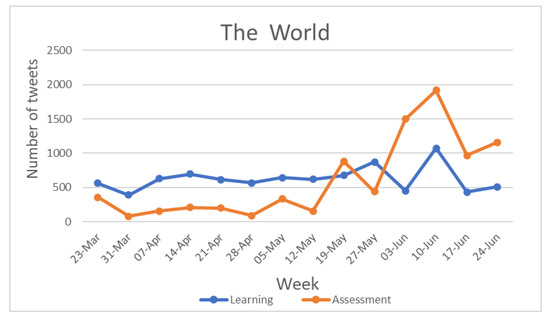 During the onset of the COVID-19 pandemic, when education changed from traditional to electronic methods, assessment-related tweets gradually outnumbered learning-related ones. Especially in June, the number of tweets posted about assessment has increased significantly. Examining the text of related tweets, we find that people’s discussion and worry has been about how the exams were going to be held.