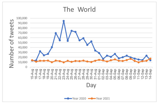 This section compares the frequency of education-related tweets for a one-month period at the beginning of the school year (15 August to 15 September) in 2020 and 2021. Figure 8 shows the frequency of education-related tweets in 2020 and 2021.