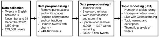 The research process is illustrated in Figure 1. The first step was data collection. The author collected tweets about “ChatGPT” in English between 30 November and 31 December 2022 (UTC time) using the Twitter API in Python. Only original tweets and self-replies (replies to one’s own tweet to form a thread) were included. The total number of tweets was 249,568. The dataset was pre-processed to remove unusable tweets. The author then tokenized the tweets, removed stop words from the “Snowball” and “Onix” libraries, and removed the three common words “ChatGPT”, “OpenAI”, and “AI”. Words were lemmatized and stemmed. Sparse words were removed to include only salient ones. Sparsity was set at 0.999, indicating that only words that appeared in at least one tweet out of every thousand were included. By setting the sparsity, we could remove irrelevant or marginally relevant words from the dataset, reducing noise and potentially improving the quality of the topics learned by the LDA model. In total, 1327 (lemmatized and stemmed) words remained for topic modeling. The final dataset consisted of 233,918 tweets.