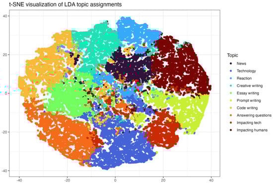 Figure 4 displays the t-distributed stochastic neighbor embedding (t-SNE) visualization of the LDA results [33]. t-SNE is a dimensionality reduction algorithm that displays high-dimensional data in two dimensions while preserving the most significant structure.