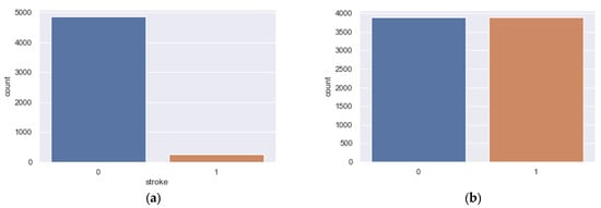 Class labels in stroke dataset (a) before applying SMOTE and (b) after applying SMOTE.