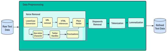 For the textual dataset, data preprocessing started with converting tweets to lowercase and removing noisy data such as URLs, hashtags, HTML references, placeholders, non-letter characters (punctuation and special characters), and Twitter handles. This step was followed by stopword removal, tokenization, and lemmatization. Some of the most significant and most important preprocessing are discussed below and shown in Figure 5.