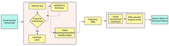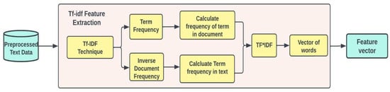 Text feature extraction is critical in the classification of text as it directly impacts the accuracy of the models [33]. A classifier is unable to understand the text directly. Hence, it is necessary to convert the text into a numerical representation. We can do this by using an indexing technique to map text data into vector form. Various feature extraction techniques have been developed to achieve the vector representation of the text. Some of the most popular methods, including Term Frequency–Inverse Document Frequency and Bag of Words, have been implemented in our study to transform text data into the vector format [33].