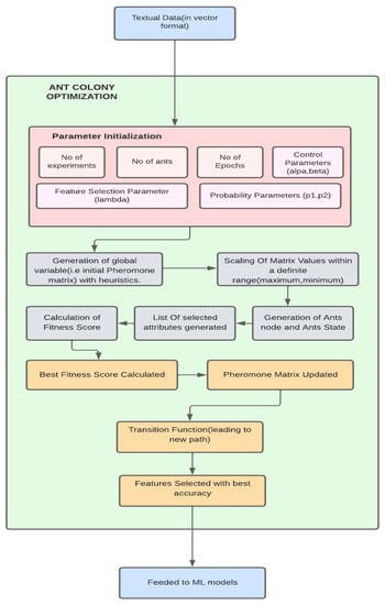 Saraç and Özel in [5] used the ACO algorithm to select the best feature using classifiers C4.5, naïve Bayes, and KNN, showing that the presented algorithm performs better than popular techniques such as Chi-square and information gain. In another work, the novel approach to the ACO algorithm with two fuzzy controllers is used, which adjusts the parameters of ACO adaptively and performs a comparison with respect to genetic algorithms on 10 different datasets. However, none of them contain textual data, which can be seen as a possible limitation [16]. The Multi-Objective Function-Based Ant Colony Optimization (MONACO) procedure for opinion classification along with popular feature extraction and feature selection techniques achieved a good performance score on the proposed algorithm, but multi-class classification was not taken into account while performing the experiment [17]. The Ant Colony Optimization algorithm shows improved performance by using the Bayesian classification method. The comparative analysis with the PSO algorithm proves that the suggested method performs feature selection efficiently with good classification performance [18,19]. To select minimum features with maximum information, Sabeena S and Balakrishnan Sarojini [20] proposed a feature selection method using ACO for classification tasks but failed to shed light on the performance with text data [20]. This research work by Imani, M. et al. [21] proposed an embedded approach to feature selection using the Chi-square approach for filtering the features. The proposed architecture suggests a hybrid approach with a genetic algorithm and Ant Colony Optimization algorithm as a wrapper method. A comparison with other methods was performed to prove the superiority of the proposed approach. However, the paper does not discuss the effectiveness of the approach on another textual dataset as well as its impact on the data having numerical columns [21].