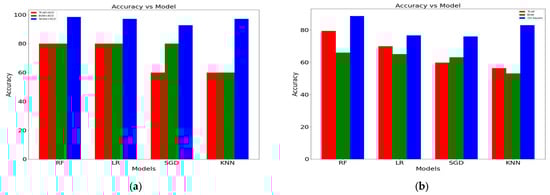Visualization is vital for sorting out various aspects and anticipating marginal contributions that may be used to assess the feature importance across different models in terms of evaluation metrics such as accuracy and the ROC-AUC curve. Since our study focuses on comparative analysis, we visualized the model performances. Figure 11a shows the accuracy achieved by the four models-RF, LR, SGD, and KNN, when trained with textual and numerical data and enhanced using ACO. The machine learning models outperform in terms of efficiency when fed with numerical data. Figure 11b further shows the performance of the same models but without any optimization algorithm. Both the figures, when compared together, establish the contribution and advantage of Ant Colony Optimization in our proposed analysis.