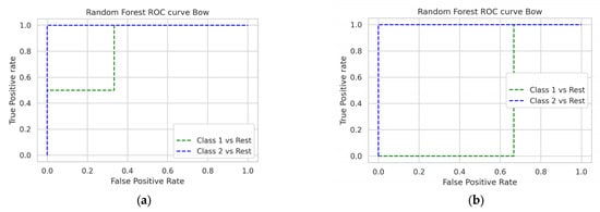 AUC-ROC statistics aid in determining a model’s capacity to discriminate across classes [50]. Hence, we decided to offer the experimental results in the most generally used evaluation measure, clarifying why we chose such a pipeline. The ROC-AUC curve was plotted for the best models integrated with ACO on textual and numerical datasets. The ROC curves were plotted for Random Forest classifier on ACO, using TF-IDF and BoW as the effective feature extraction techniques. The curve proves that the proposed model is sufficient to correctly predict the target labels since the area under the curve is significantly large, as shown in Figure 12a,b. Moreover, we can observe that the area underclass positive is highest for ACO on textual data with TF-IDF and almost equal for neutral and negative, which is directly proportional to the prediction level of the model for each target label. The ROC-AUC scores obtained for TF-IDF and BoW are 0.88 and 0.77, respectively, which indicate that the models are moderate classifiers.