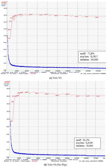 The training results for Yolo V4 model. (a) Yolo V4, (b) Yolo V4 (No Flip).