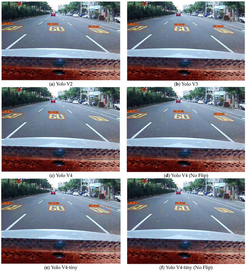 The road marking sign misrecognition results. (a) Yolo V2, (b) Yolo V3, (c) Yolo V4, (d) Yolo V4 (No Flip), (e) Yolo V4-tiny, (f) Yolo V4-tiny (No Flip).