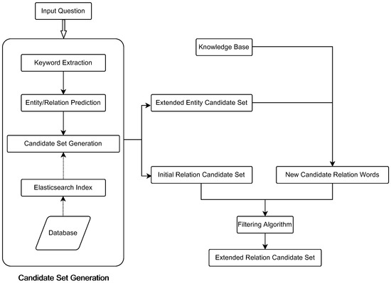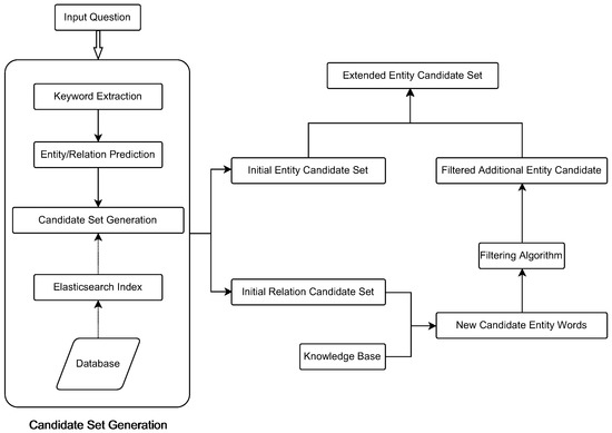 Early KBQA efforts focused on simple problems. In recent years, researchers have gradually increased their attention to complex questions, and complex questions contain more than one entity word and relation word. When multiple entity words and relation words exist in a problem, it becomes difficult to link the entity words and relation words in the question to the corresponding entities and relations in the knowledge base. At this point, many people start to increase their research efforts on entity and relation linking. In recent years, deep learning has been widely used in entity linking. Several studies have introduced neural networks into entity-linking models and used deep-learning-based models to solve entity-linking problems. For example, BERT [14] and RoBERTa [15] have been widely used in entity-linking tasks with good results. The application of entity linking in multilingual situations has also received attention. Some studies have explored cross-lingual entity-linking [16] approaches using knowledge bases in the same language for linking entities in multiple languages. Other studies have focused on using multilingual knowledge bases or multilingual training data to solve multilingual entity-linking [17] problems. Some studies have explored the use of knowledge base embedding [18] and transfer learning [19] to address entity and relation linking. Knowledge base embedding can embed entities and relations into a vector space, thus supporting vector-based entity-linking methods. Transfer learning, on the other hand, can use existing knowledge bases and training data to improve the performance of new entity-linking models. Some studies combine entity and relation linking for joint learning to improve the performance of both tasks. For example, some studies have proposed methods to perform entity and relation linking as a joint task [9,20]. Overall, recent research in entity and relation linking has focused on improving the performance of models and generalizing them to multilingual and multi-domain applications. Before that, a part of the research focused on the improvement and refinement of entity disambiguation [21,22,23,24] or relation disambiguation algorithms [25,26]. However, the candidate set generation module, which also has an important role in the overall linking system, has yet to receive much attention. When the coverage of the candidate set generation module is low, the sorted candidate set may not contain the correct answers, thus reducing the performance of the linking model and hence the accuracy of the quiz.