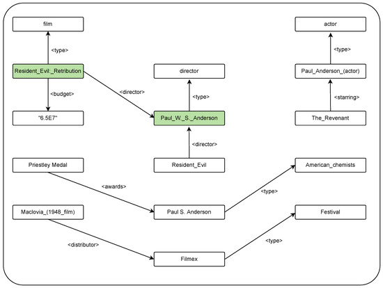 Taking the question “What is the budget of the film directed by Paul Anderson and named Resident Evil: Retribution?” as example (1), its correct partial RDF diagram is shown in Figure 5. This is the question (1) “What is the budget of the film directed by Paul Anderson and named Resident Evil: Retribution?” in the knowledge. This is a partial subgraph of the knowledge graph. Figure 5 mainly depicts the entities and relations related to question (1). The two correct entities for this paper are marked in green. Due to the current keyword tool itself, “Resident Evil” and “Retribution” are used as the keywords for the entity “Resident Evil: Retribution” in question (1). The entity keyword “Paul_W._S_Anderson” for “Paul Anderson” is not added to the set of entity candidates.