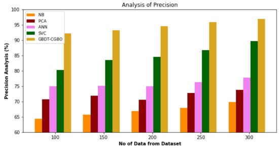 Precision Analysis of GBDT-CGBO method with existing system in percentage.