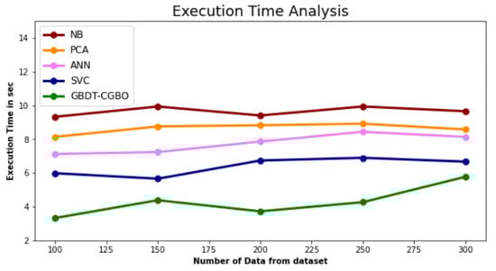 In Table 5, how the GBDT-CGBO technique’s execution time compares to that of existing techniques is detailed. The data clearly shows that the GBDT-CGBO method has outperformed the other techniques in all aspects. For example, with 100 data, the GBDT-CGBO method has taken only 3.327 s to execute, while the other existing techniques such as NB, PCA, ANN and SVC have an execution time of 9.321 s, 8.632 s, 7.123 s and 5.980 s, respectively. Similarly, for 300 data points, the GBDT-CGBO method has an execution time of 5.765 s while the other existing techniques such as NB, PCA, ANN and SVC have taken 9.652 s, 8.576 s, 8.132 s and 6.665 s of execution time, respectively as shown in Figure 6.