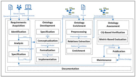In this context, ontology engineering has lately garnered great attention [13]. It is defined as “the set of activities that concern the ontology development process, the ontology life cycle, and the methodologies, tools and languages for building ontologies” [14]. One of the objectives of this branch of engineering is to offer a method to develop ontologies. For several reasons, developing domain ontologies is a challenging task. One of these reasons is that it is a complicated and time-consuming process [15]. Further challenges and possible future directions have been proposed in [16].