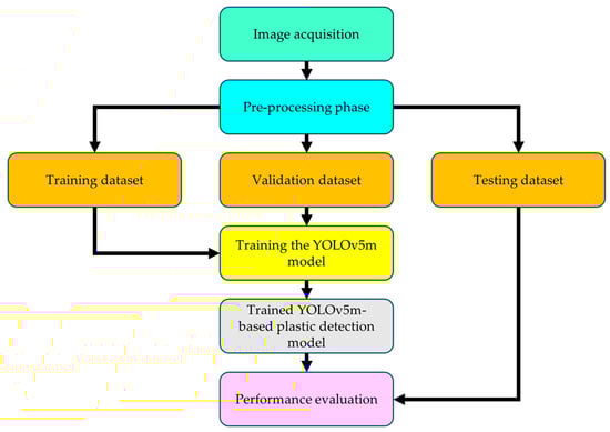 The proposed approach for developing a plastic waste detection model is depicted in Figure 1. The proposed flowchart outlines a comprehensive approach for developing a plastic waste detection model. The process begins with image acquisition, followed by data pre-processing, which involves several steps such as data cleaning, cropping, resizing, and annotation. The pre-processed data is then split into three datasets including training, validation, and testing, to ensure the model’s generalizability. The training phase involves training and validating the model using the training and validation datasets, respectively. The fine-tuned plastic waste detection model is then evaluated on the testing dataset to assess its performance on an unseen dataset. The evaluation process includes assessing the model’s recall rate, precision rate, and mAP@0.5. This proposed methodology offers a systematic and effective approach for developing a plastic waste detection model, which could have significant implications for managing plastic waste in the environment.
