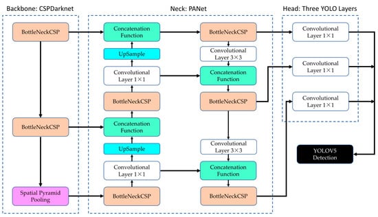 The YOLOv5 model is a state-of-the-art object detection model that utilizes a combination of three components, including (i) CSPDarknet53 as the backbone, (ii) Path Aggregation Network (PANet) as the neck, and (iii) three YOLO heads [29]. The model is implemented using PyTorch as the framework, and the open-source code is publicly available on GitHub. The combination of these components allows for the effective and efficient detection of objects, making YOLOv5 a valuable tool in various object detection applications. In the YOLOv5 object detection model, the image is first processed by the CSPDarknet53 component for feature extraction, which utilizes cross-stage partial networks. This extracted feature representation is then passed to the PANet component, which contains a feature pyramid network (FPN). The PANet component of the YOLOv5 object detection model consists of multiple layers that facilitate the propagation of low-level features through the use of both top-down and bottom-up connections. This design allows for the efficient and effective processing of the feature representation extracted by the CSPDarknet53 component. The resulting feature representation is then passed to the three heads layer, which generates predictions from anchor boxes for the purpose of object detection. Figure 2 shows the network architecture of YOLOv5.