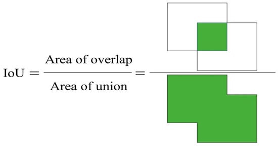 This study utilizes three primary performance metrics, including precision, recall, and mean average precision (mAP). These metrics allow for the quantification of the model’s ability to accurately and reliably detect objects and are essential in evaluating the suitability of the model for various object detection tasks. Two variations of the mAP metric were also used, (i) mAP@0.5 and (ii) mAP@0.5:0.95. The mAP is a measure of the average precision (AP) calculated for all classes. As plastic waste is the only class being considered in this study, the computed mAP represented the AP for all plastics. The intersection over union (IoU) had to be specified first to calculate the AP. The IoU is a metric that quantifies the overlap between the ground truth bounding box and the predicted bounding box. It is calculated as the ratio of the intersection area to the union area of the two bounding boxes. This metric is widely used in the evaluation of object detection models, as it allows for the assessment of the model’s ability to accurately identify and locate objects within an image. An example of the IoU is shown in Figure 3. To classify a detection as correct or incorrect, a threshold value is compared to the IoU value calculated for the predicted and ground truth bounding boxes. A threshold value of 0.5 is commonly used in the evaluation of object detection models and is the value chosen in this study.