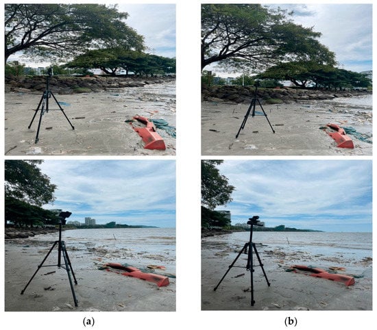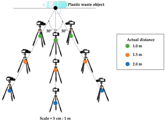 To ensure the acquisition of high-quality and representative images of plastic waste, the tripod stands were positioned at various distances and angles, with a focus on the plastic waste objects. There were two main criteria for setting the position of the tripod. The first criterion was that the distance of the camera from the plastic objects had to be adjusted at 1.0, 1.5, and 2.0 m apart. As a second criterion, the camera’s angle, with respect to the subject, was set to the object’s center, as well as 30 degrees to the left and right. By considering the angle of the camera in relation to the object, the dataset could be optimized to better represent the range of perspectives that the object detection model was expected to encounter in real-world scenarios. The setting of the camera used in this study was that for each distance, the camera was adjusted with three different angles. The image acquisition started off using the iPhone 12 to create the RGB datasets. Then, the RGB camera was swapped with the Mapir Survey 3W on a different tripod stand to create the RGNIR datasets. As depicted in Figure 5, the position of the camera on the tripod was varied in terms of distance and angle to ensure the acquisition of a diverse and representative dataset for the evaluation of the object detection model.